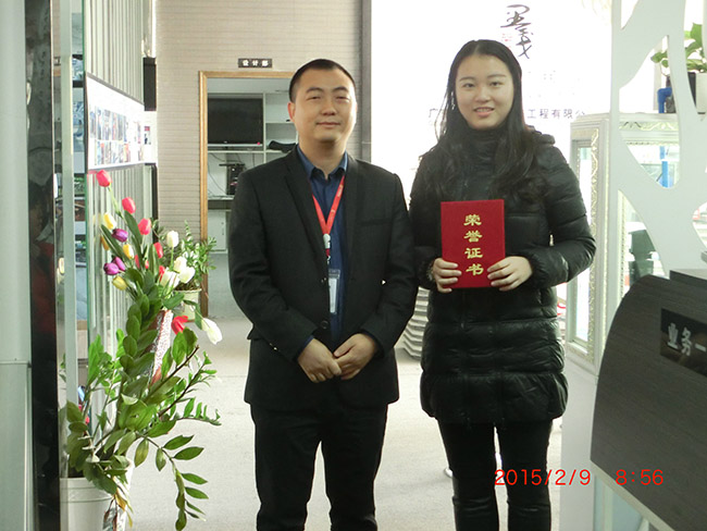 工作安排后是對員工的頒獎儀式,業(yè)務部助理周卓曉年后將結束自己的實習期,回到學校繼續(xù)課程的展開,她為公司業(yè)務部的付出,對年會策劃的共享我們不會忘記,為了表揚她一直以來的敬業(yè)精神,今天由業(yè)務總監(jiān)李春忠為她頒發(fā)了“最佳實習獎”獎項,鼓勵她日后做得更好,飛的更高。