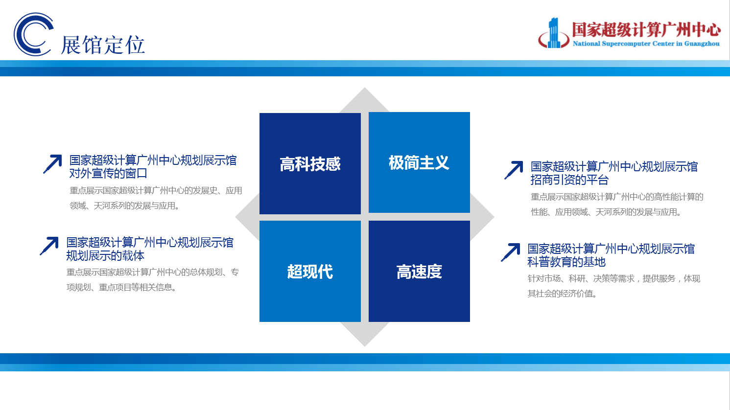 項(xiàng)目介紹:國(guó)家超級(jí)計(jì)算機(jī)——智能科技展廳設(shè)計(jì)裝修,本案設(shè)計(jì)中,秉承超科技、超現(xiàn)代的理念,力圖將超級(jí)計(jì)算機(jī)有機(jī)的融合到展館中,讓專(zhuān)業(yè)的行業(yè)信息通過(guò)體驗(yàn)互動(dòng)式的方式傳達(dá)給參觀者,達(dá)到一種科普教育的目的,讓參觀者真正感受到速度改變生活,超算改變未來(lái)的理念。同時(shí)根據(jù)展館空間需求,在設(shè)計(jì)上滿足了各展區(qū)可更替性要求。我們以F小子first(第一),fast(快),future(未來(lái))為故事主人公來(lái)引領(lǐng)觀眾體驗(yàn)“速度改變生活,超算改變未來(lái)”的奇幻旅程,從而使觀者在移步換景中,仿佛穿梭在數(shù)字化帶來(lái)的時(shí)光隧道中。